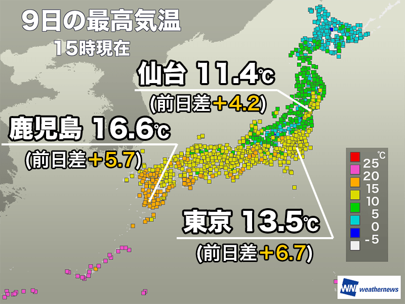 九州は広い範囲で最高気温が15℃を上回り、四国や近畿、東海でも一部で15℃以上となっています。昨日は雪や雨が降って寒い一日となった関東も15℃近くまで上がって日差しが暖かでした。