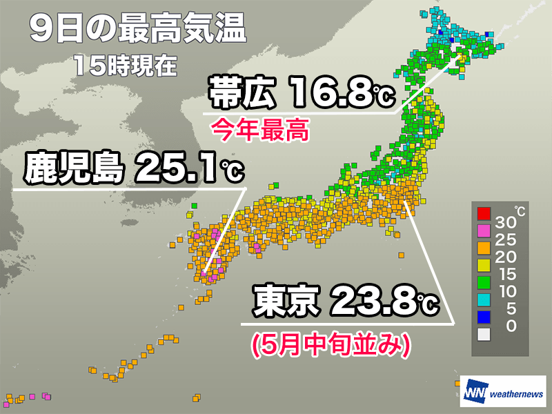 東京では5月中旬並みの23.8℃を観測し、4月に入ってからは最も高い最高気温となりました。