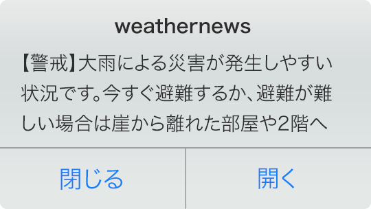 設定をオンにすると、位置情報をもとに今いる場所の最新気象情報(大雨・台風・地震・津波など)を入手できます。