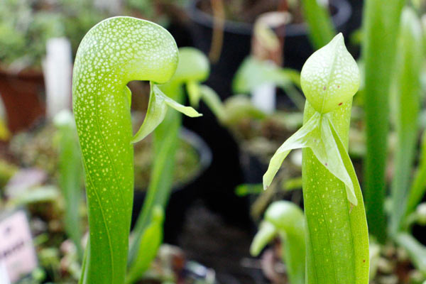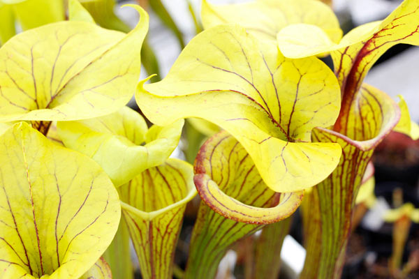 カナダ南東部から北アメリカ東部、南部に8種が分布します。なかが空洞になった筒状の捕虫葉が多数あり、そこに落ち込んだ虫が消化される「落とし穴式」の食虫植物です。茎が極端に短く這うように伸びるので、捕虫葉が地面に直立して並んでいるように見えます。