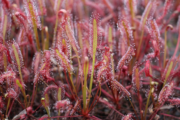葉の表面に腺毛(せんもう)と呼ばれる毛がびっしりと生えていて、腺毛の先からねばねばした粘液を出して、虫を捕らえる「粘着式」の食虫植物です。捕らえた虫は葉や腺毛で内側に巻き込みます。粘液からは消化酵素も分泌され、消化された虫は腺毛から吸収されて栄養になります。