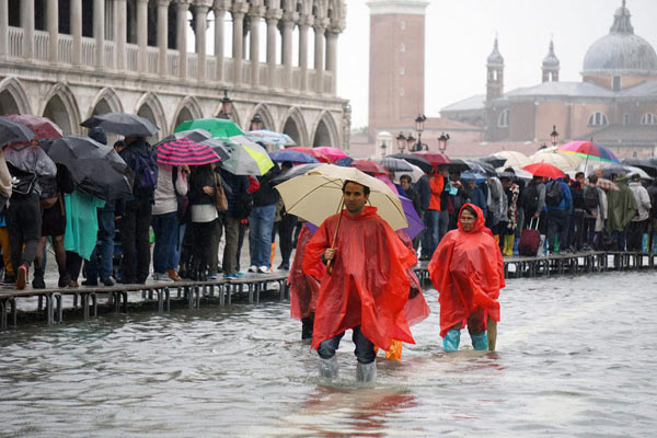 原因は海面上昇だ。ヴェネチア随一の観光名所、サン・マルコ広場は海抜80cmと市内でも一番の低地。ここがしばしば水に浸かり、観光客は長靴を履いて移動している。