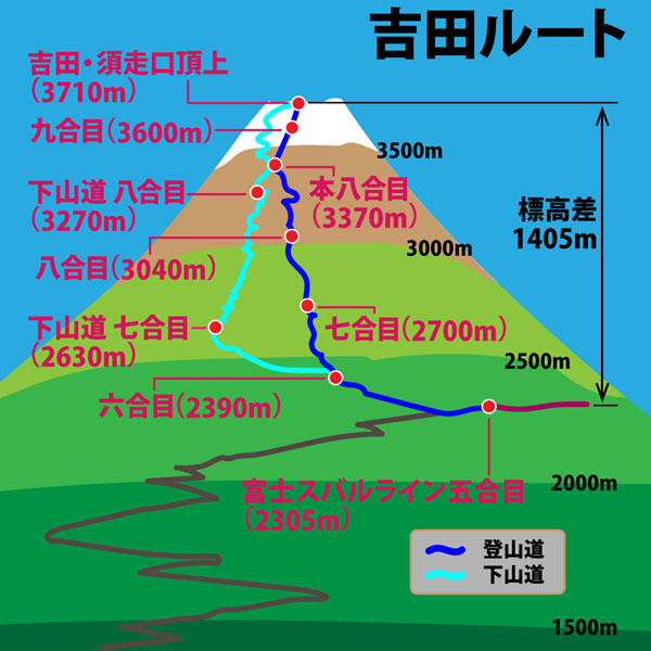 富士登山には、大別して吉田ルート、富士宮ルート、須走(すばしり)ルート、御殿場(ごてんば)ルートの4つのルートがある。吉田ルートは山梨県側、ほかは静岡県側になるが、登山者の6割近くが吉田ルートを選んでいる。