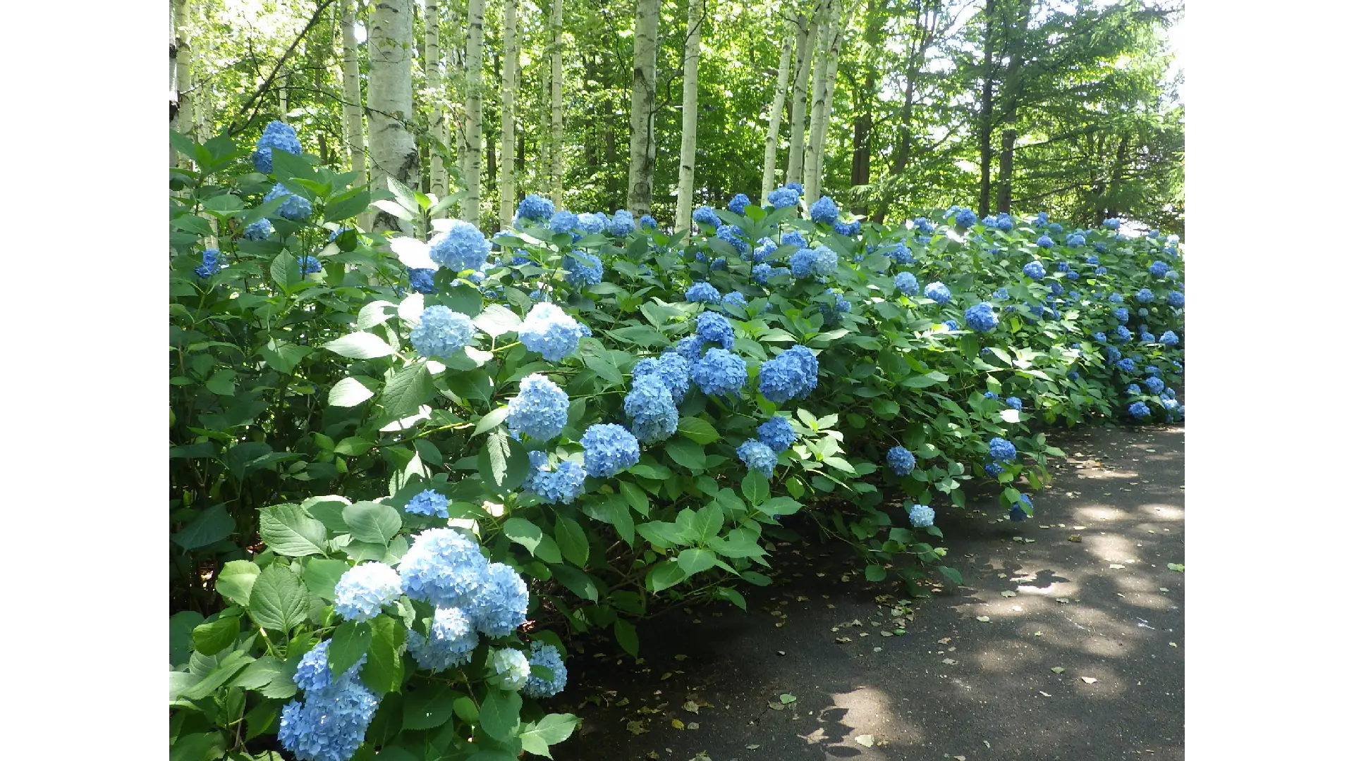 公園内白樺林外周を囲むように植栽されており、アジサイの花の青色と白樺の白い樹皮とのバランス景観が人気である。