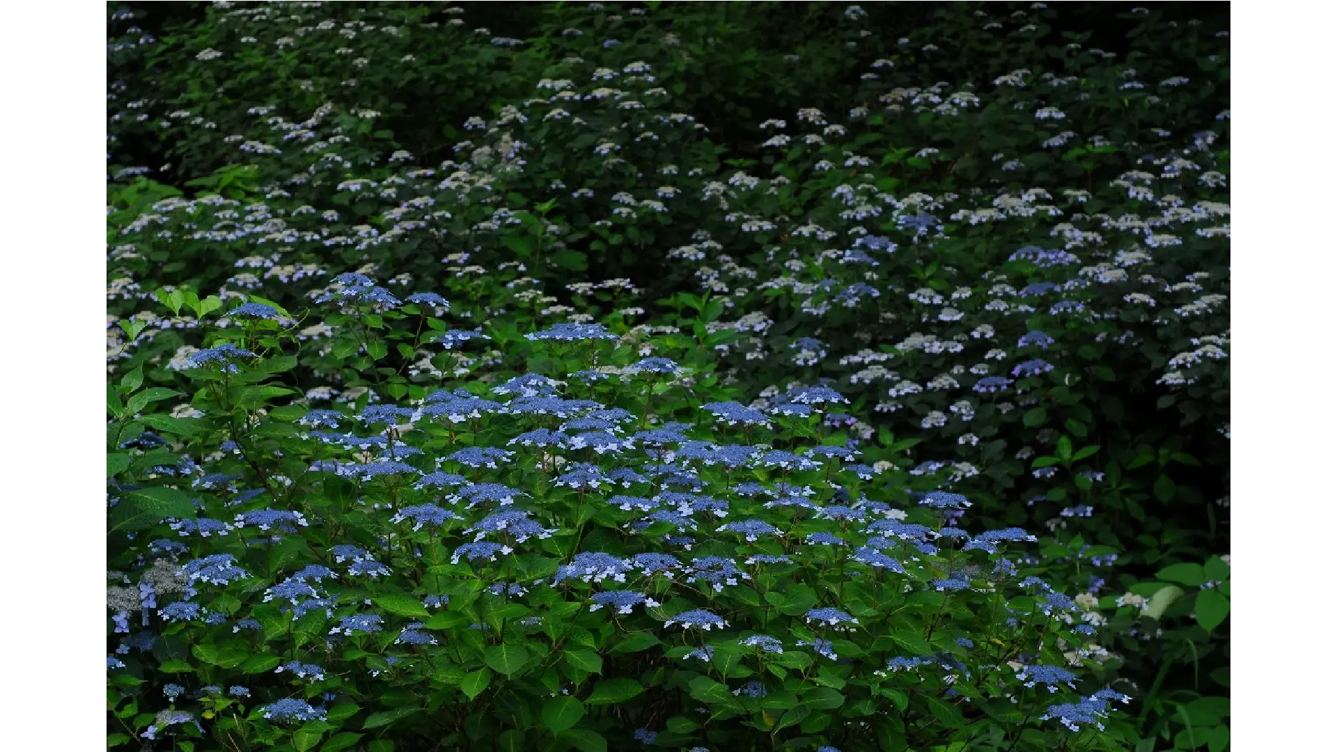 沢地に面した土地150mにわたり東北の山に咲くエゾアジサイの群生が見られます。さわやかな青色をしたやさしい花の姿は原種の持つ独特の美しさがあります。