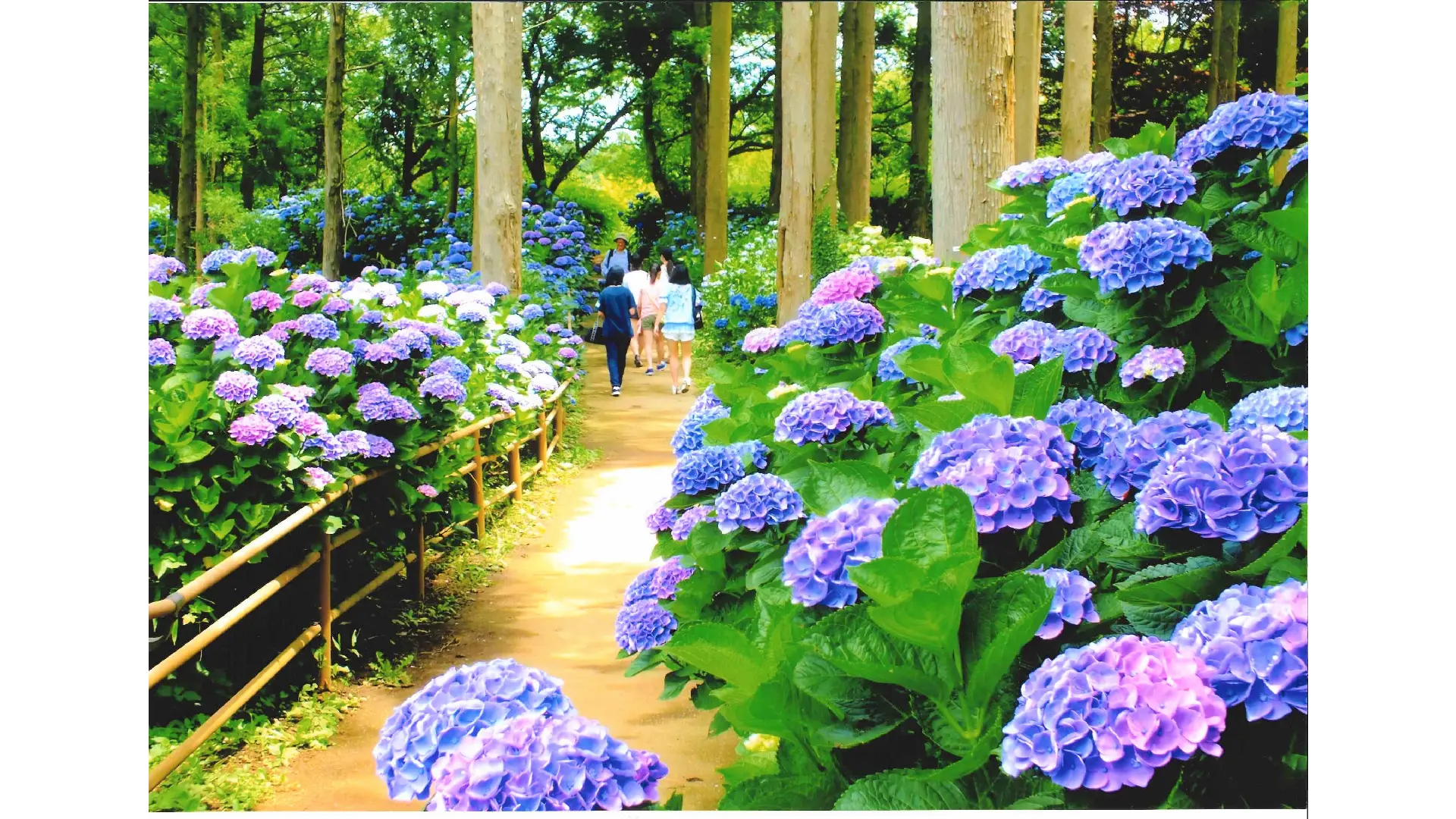 涸沼自然公園の「あじさいの谷」には約1.5kmの散策路があり自然の地形を活かし山の斜面にあじさいが植えられています。見渡す限り咲き誇るあじさいのパノラマは必見です。