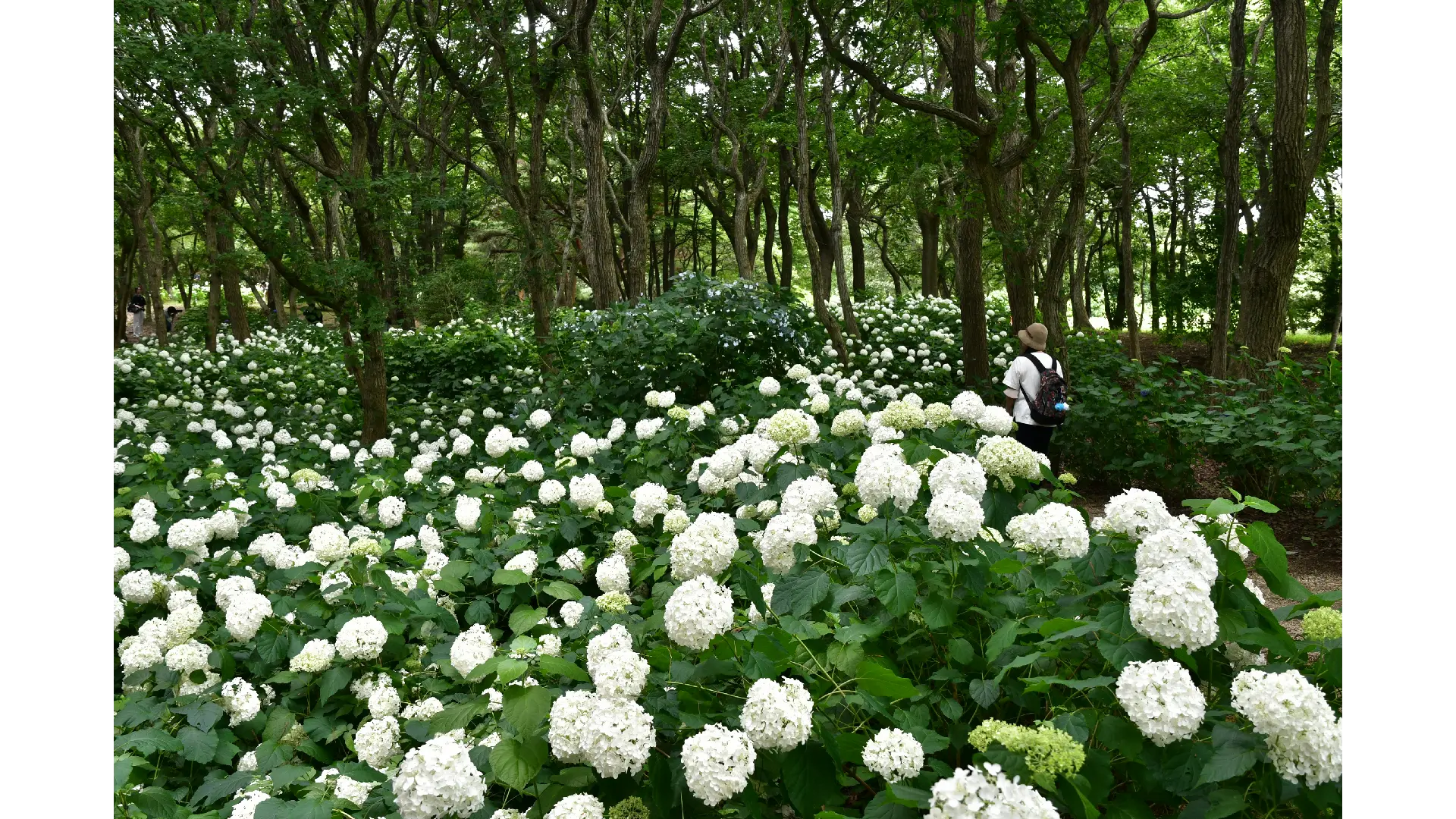 雨に濡れた花は緑がより鮮やかになり、白いアジサイをより一層引き立てます。また、天気が良い日には、木漏れ日が差し込む林内で、ゆらゆらと揺れる光が作り出す幻想的な風景をお楽しみいただけます。