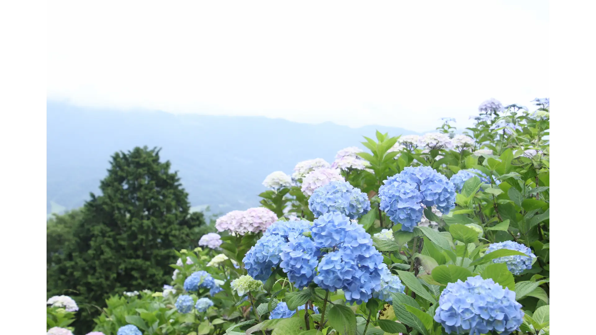 梅雨の季節、約4000株のアジサイの花が、眺望素晴らしい美の山東斜面を鮮やかに彩ります。美の山山頂に広がる色とりどりのアジサイは人気のスポットです。