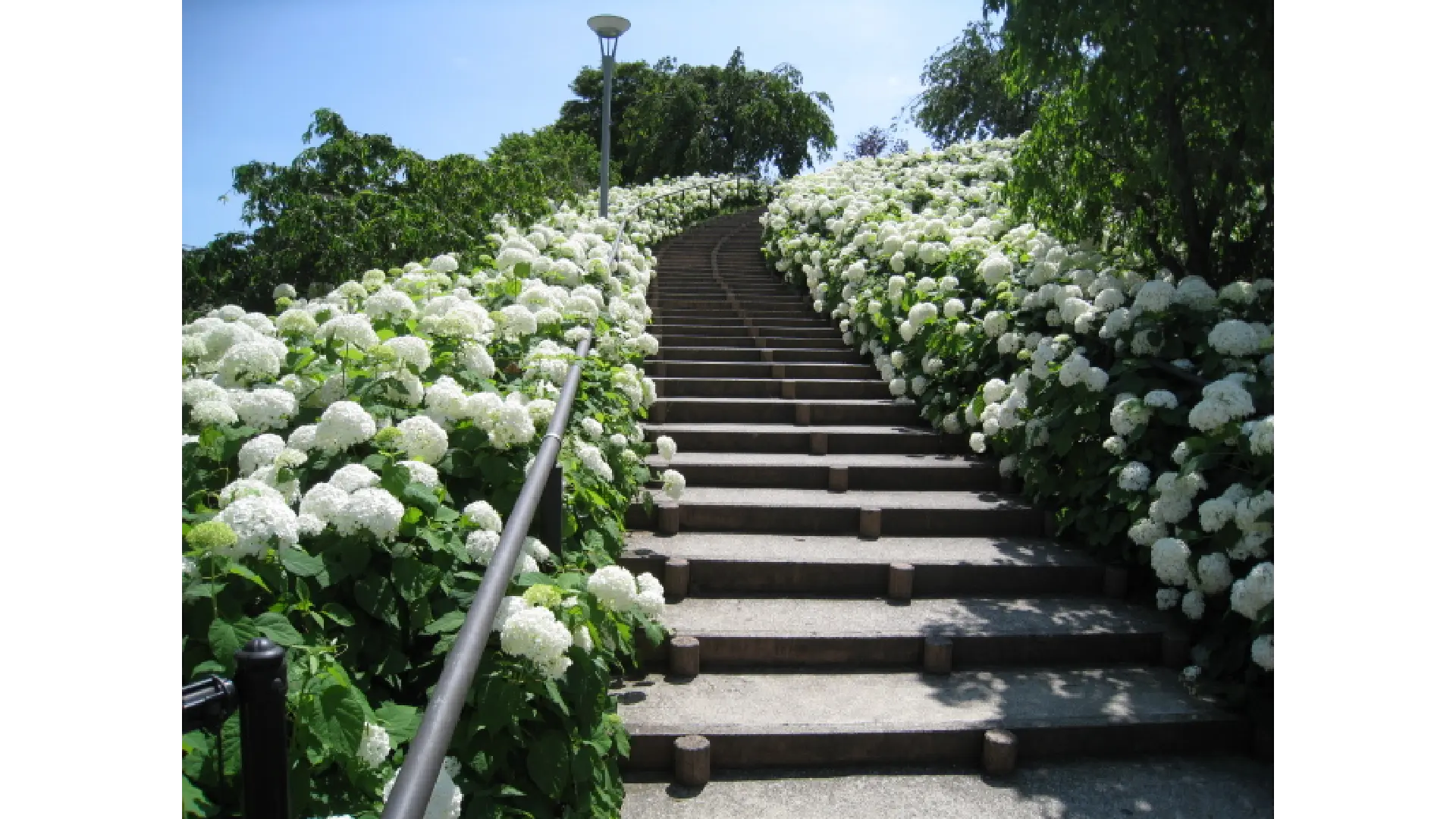 シンボルプロムナード公園では、アジサイが美しく咲き誇ります。雨のしずくに濡れてなおいっそう輝くアジサイは、私たちの心を和ませてくれます。うっとうしい梅雨が愛おしく感じますね。