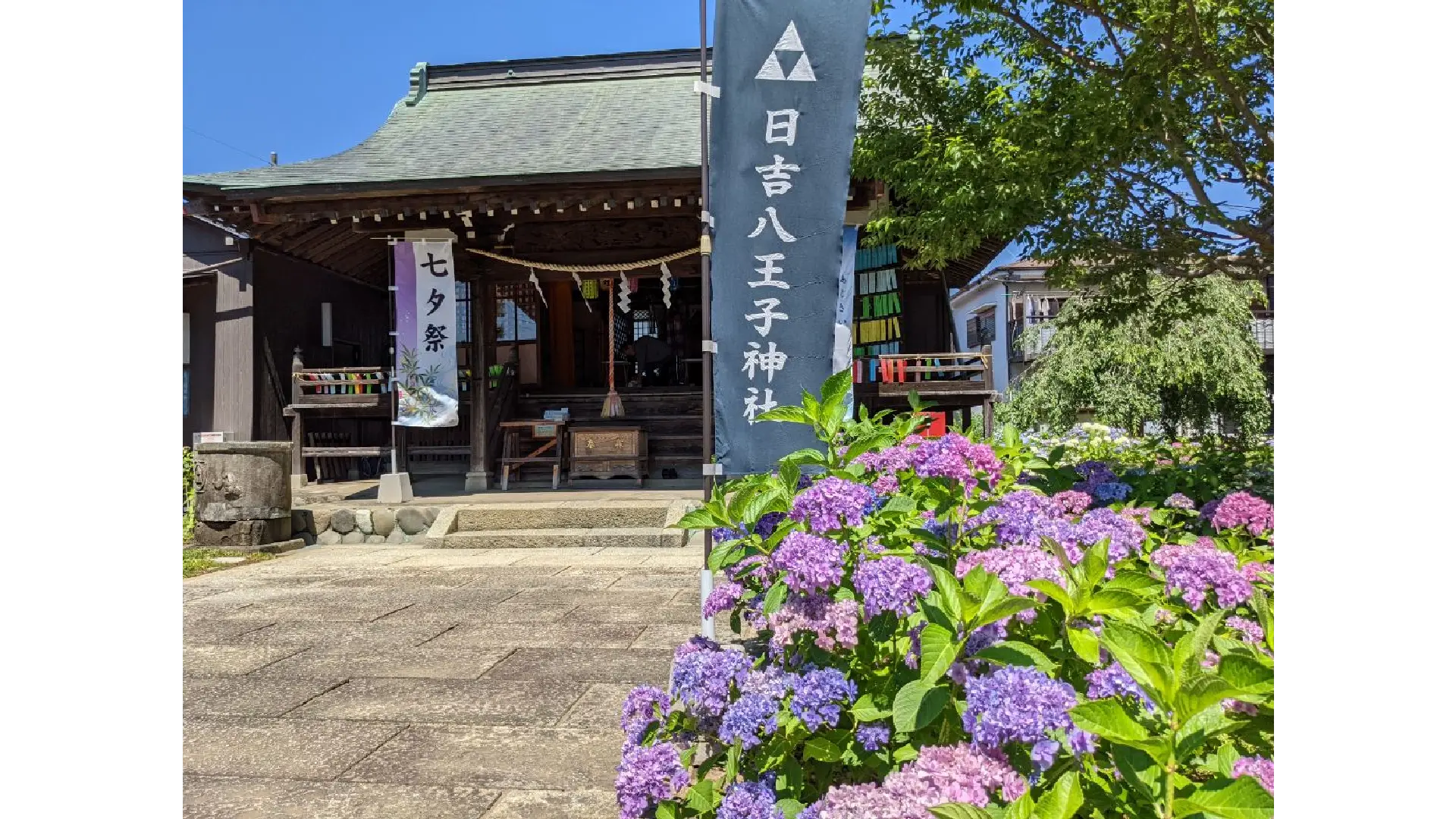 940年創建の日吉八王子神社には、ヤマアジサイやアナベルを中心に300株の紫陽花が咲きます。また一年を通して季節の草花等の絵柄の御朱印を頒布しています。(6、7月は紫陽花柄です)