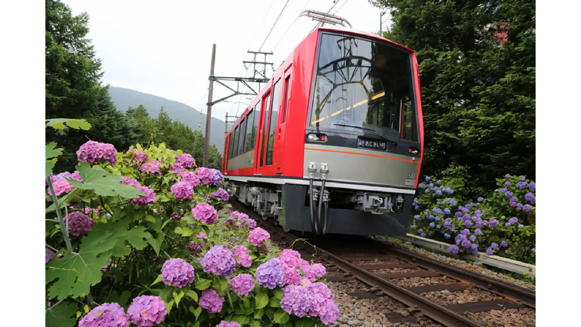 沿線各所に咲くあじさいをお楽しみいただけます。このあじさいが咲く時期の箱根登山電車は「あじさい電車」の愛称で親しまれています。各地点の標高差により、あじさいの咲き始める時期に違いがあるため、7月上旬まで楽しめます。