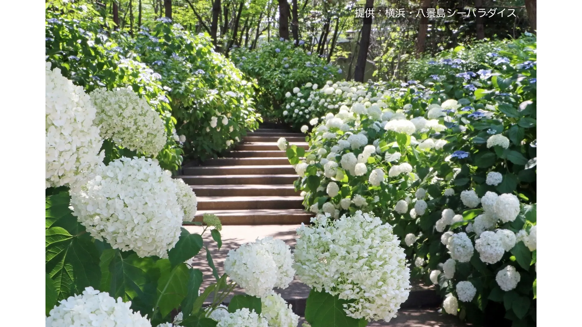『あじさいの滝』では、白いあじさい「アナベル」が清流のように咲き誇ります。