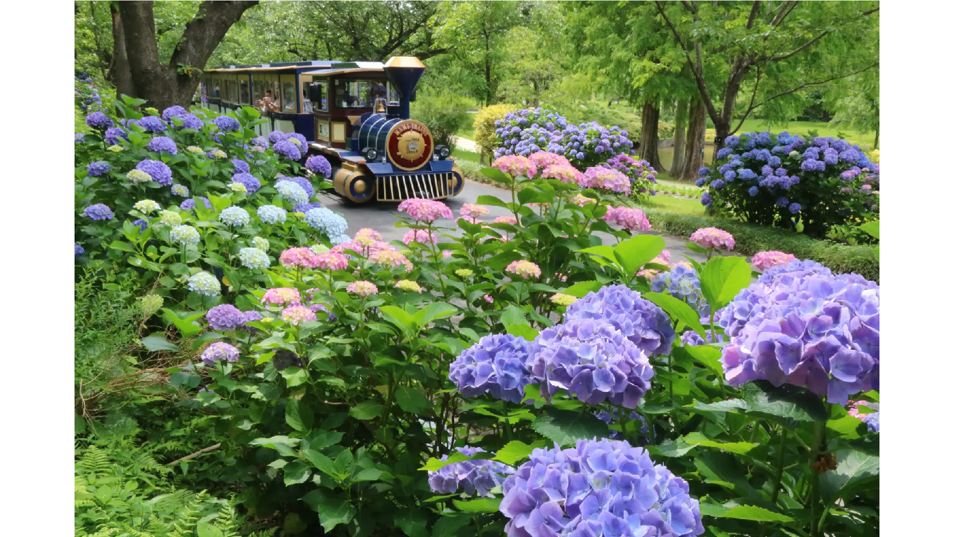 長さ600mのアジサイ並木では3000株の西洋アジサイが、また野生アジサイ園では日本各地に自生する500株のヤマアジサイ、ガクアジサイなどが楽しめる。