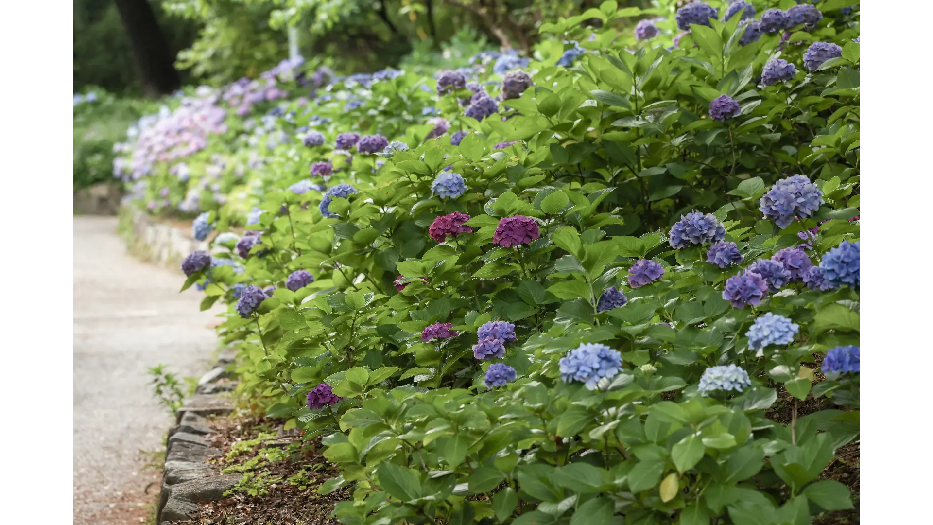 園内の南側に「あじさいの散歩道」があり青、ピンク、薄紫など彩り豊かなアジサイが並んでいます。また、雨が降った後のアジサイは特に鮮やかです。