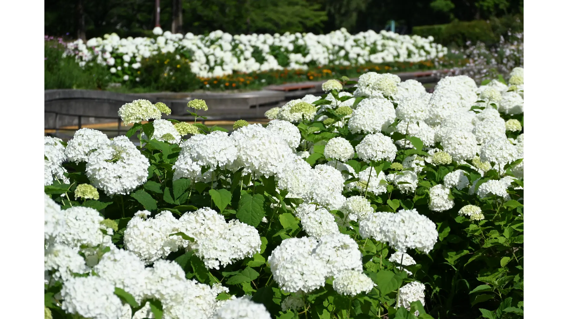 西洋アジサイ「アナベル」は咲始めの薄い緑から白く変化し、また薄い緑に色が変わるのが特徴で長く楽しめます。6月に真っ白に咲く200株のアナベルは荒子川公園の人気スポットです。