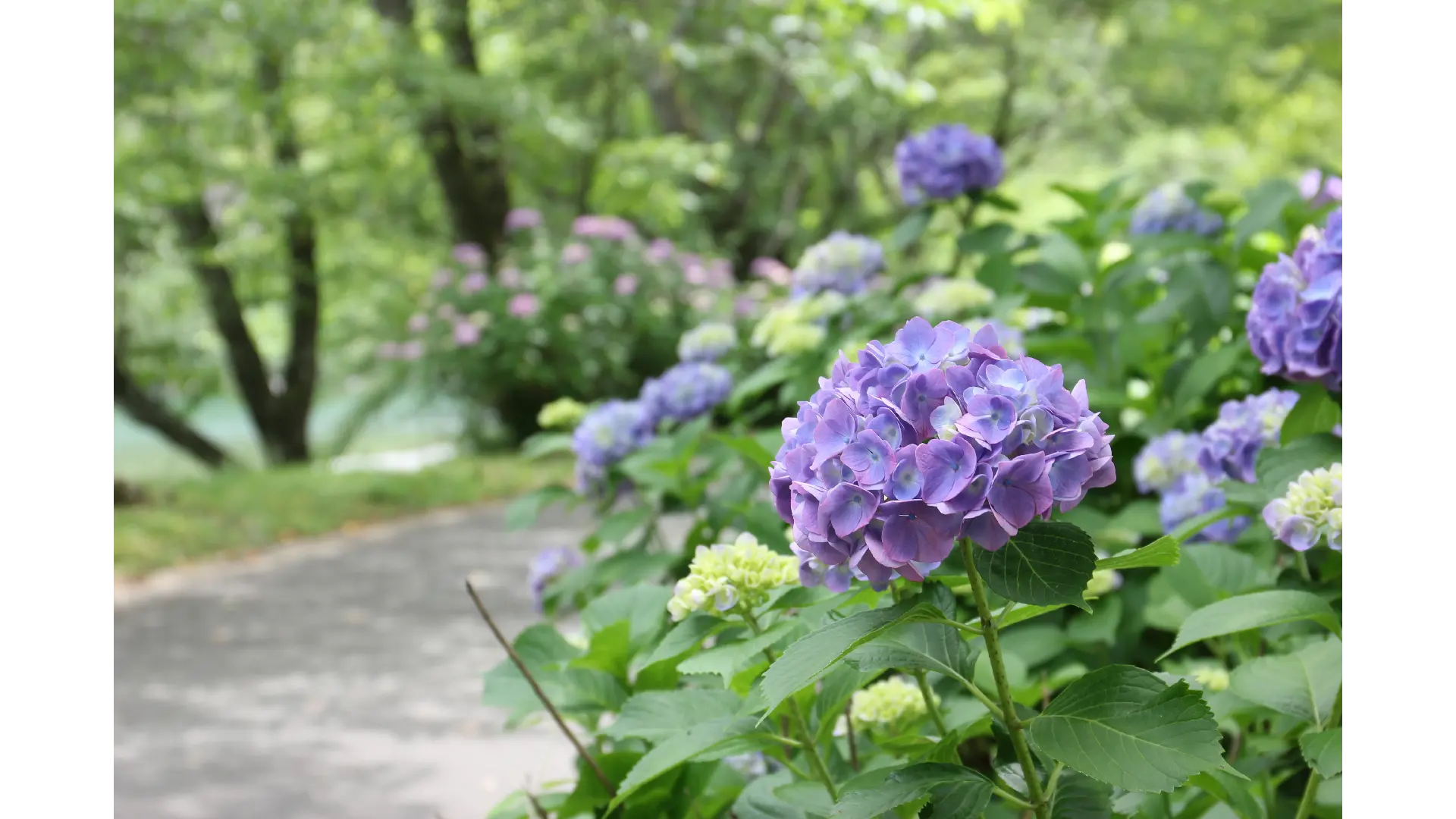 宮川沿いの遊歩道の両脇に約300株のあじさいが咲いています。川のせせらぎとあじさいを楽しみながらのウォーキングに最適です。