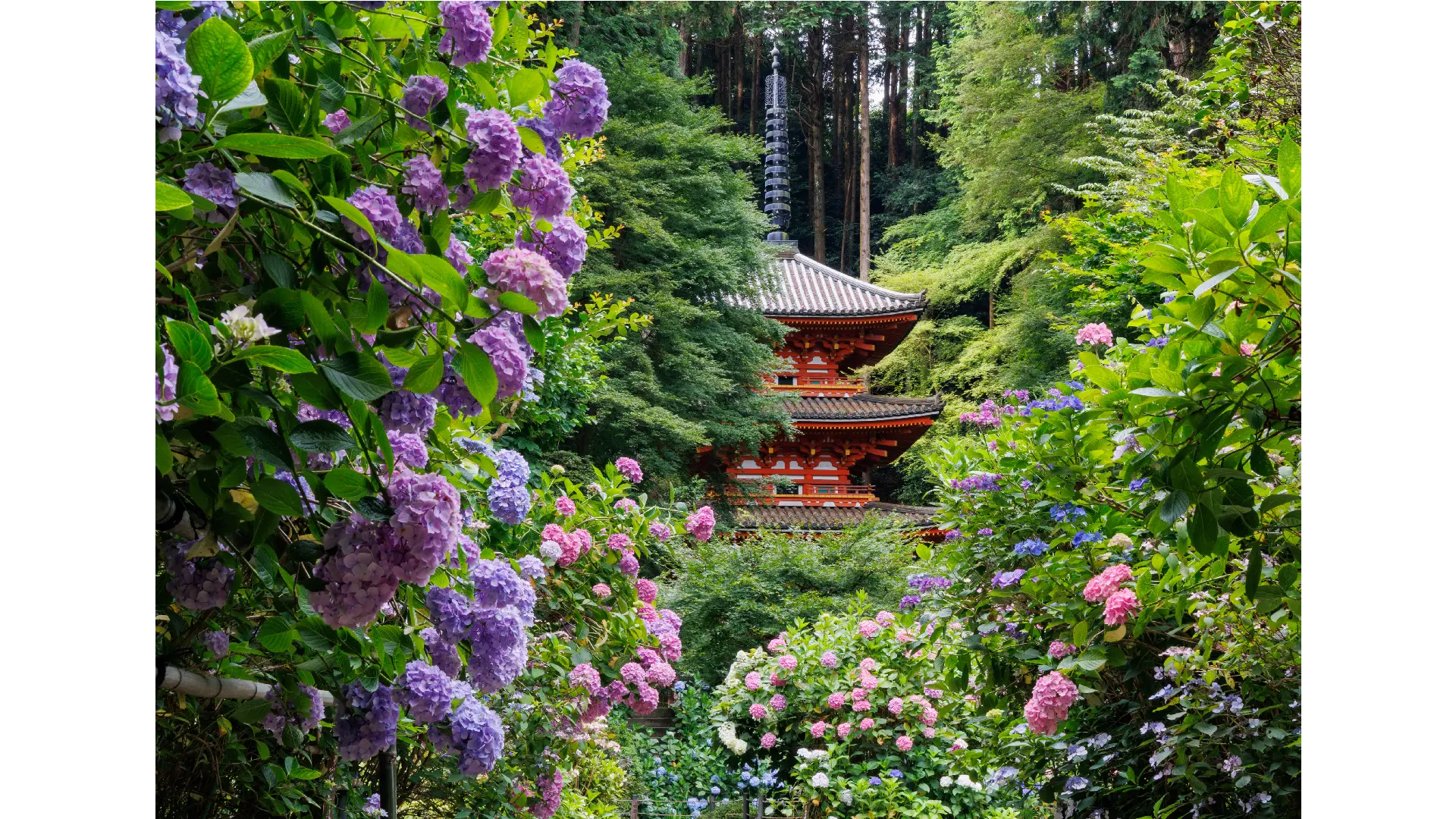 静寂な境内には四季を通じて多くの花が咲き誇ります。特に梅雨時期に咲くアジサイは赤色、青色、白色など鮮やかな色彩が境内を染めます。岩船寺のアジサイは昭和12年頃、先代住職が荒廃した境内地を美しく取り戻そうと植えたのが始まりです。現在は境内に原種の山アジサイ、西洋アジサイ等約35種、5000株以上の花が人の心をなごましてくれます。夏から初秋にかけて咲く、ピンポン玉のようなつぼみが割れて、額咲きの花をつける面白い「タマアジサイ」もあります。特に重要文化財の三重塔を背景に咲くアジサイは見事な絶景です。
