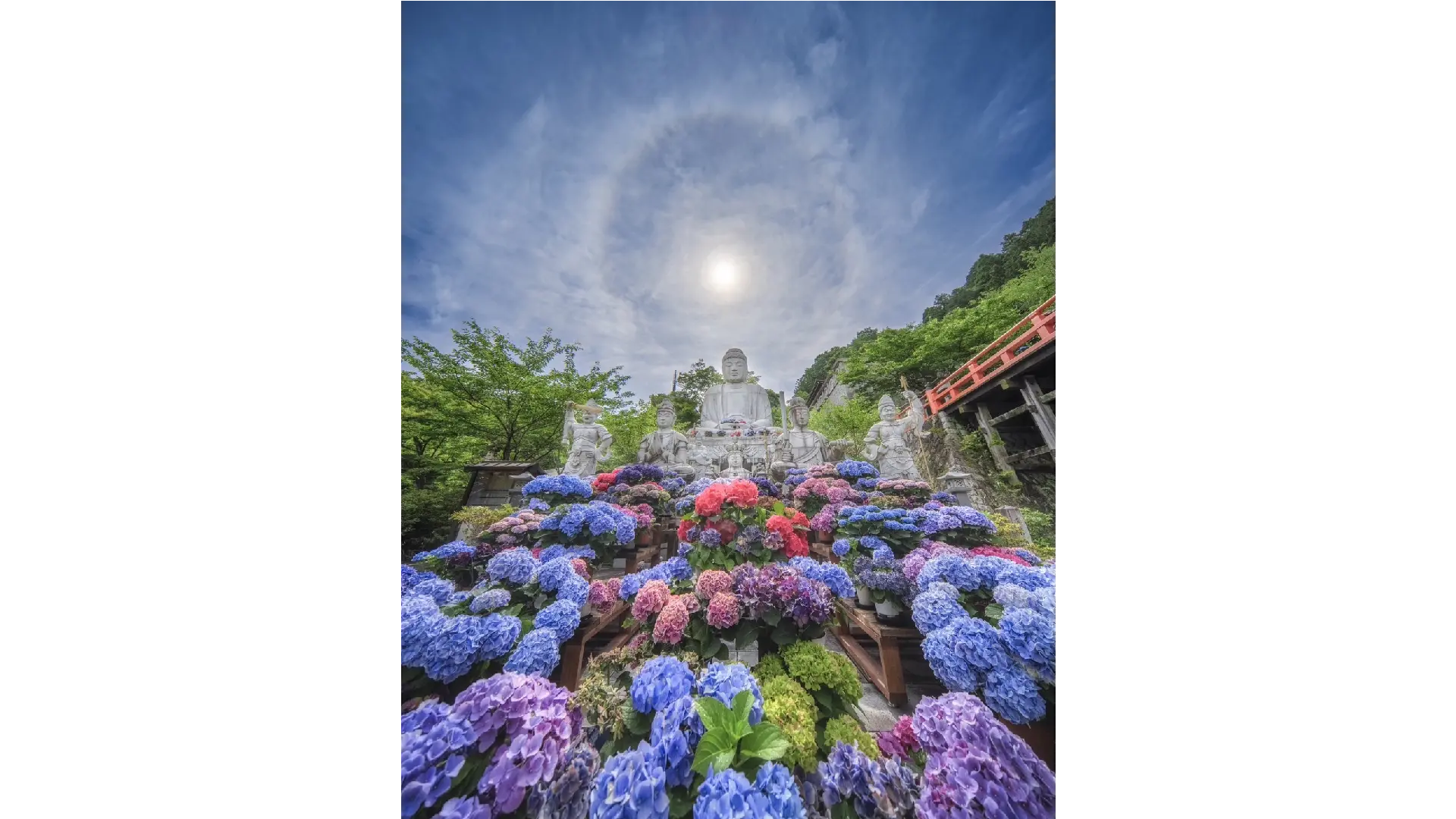 桜大仏で有名な壷阪大仏の周囲に様々な種類や色の紫陽花鉢を荘厳したアジサイ大仏様をご覧いただけます。