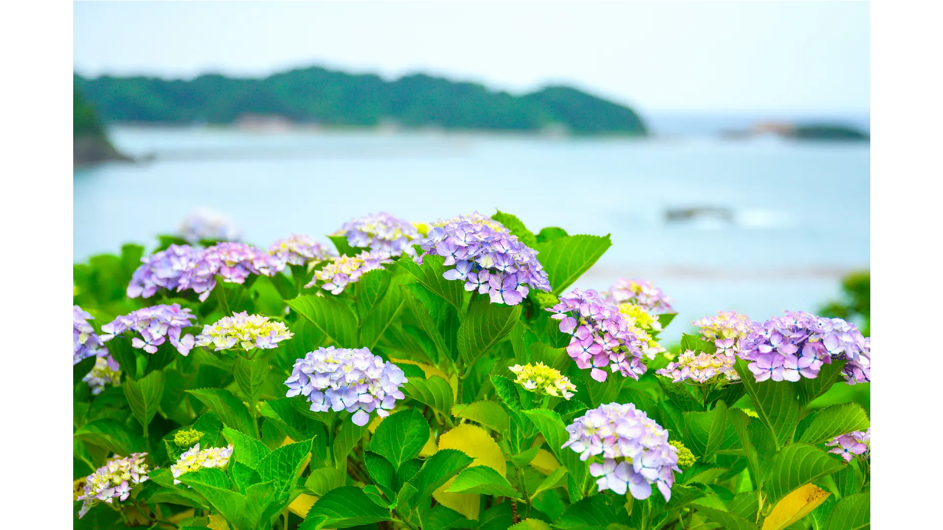 国立公園指定の海岸線沿いに咲く色とりどりのあじさい。海の眺めもよく、ドライブコースにピッタリです。