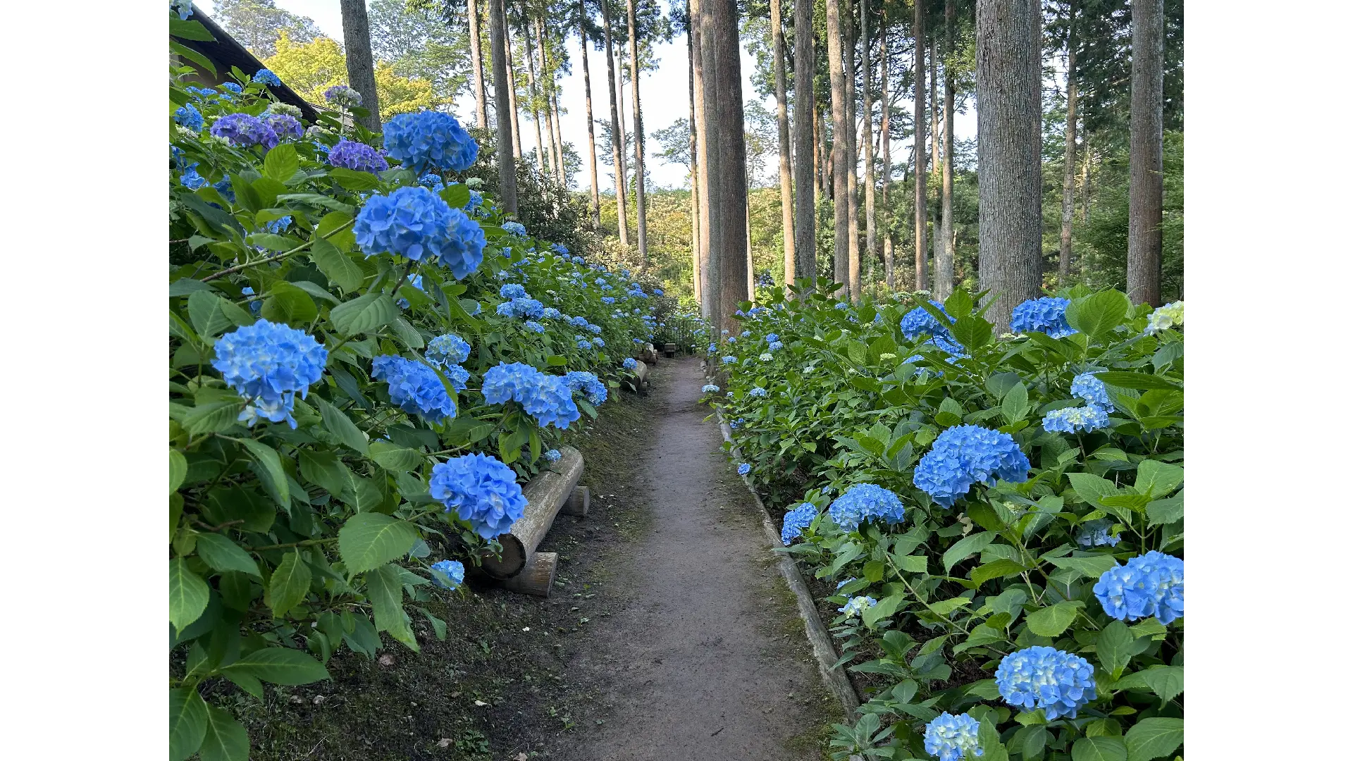 あじさい苑は青一色のアジサイが見られます。カッコウが鳴く境内で、青もみじの緑とアジサイの共演が楽しめます。また鐘楼堂周辺は色とりどりのアジサイが咲き、華やかな雰囲気です。あじさいの見頃に合せて蚤の市「観音市」が開催され、キッチンカーや屋台、雑貨店などが出店します。