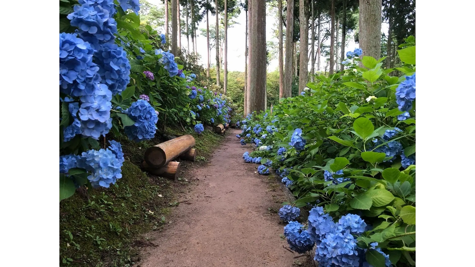 あじさい苑は青一色のアジサイが見られます。カッコウが鳴く境内で、青もみじの緑とアジサイの共演が楽しめます。また鐘楼堂周辺は色とりどりのアジサイが咲き、華やかな雰囲気です。あじさいの見頃に合せて蚤の市「観音市」が開催され、キッチンカーや屋台、雑貨店などが出店します。