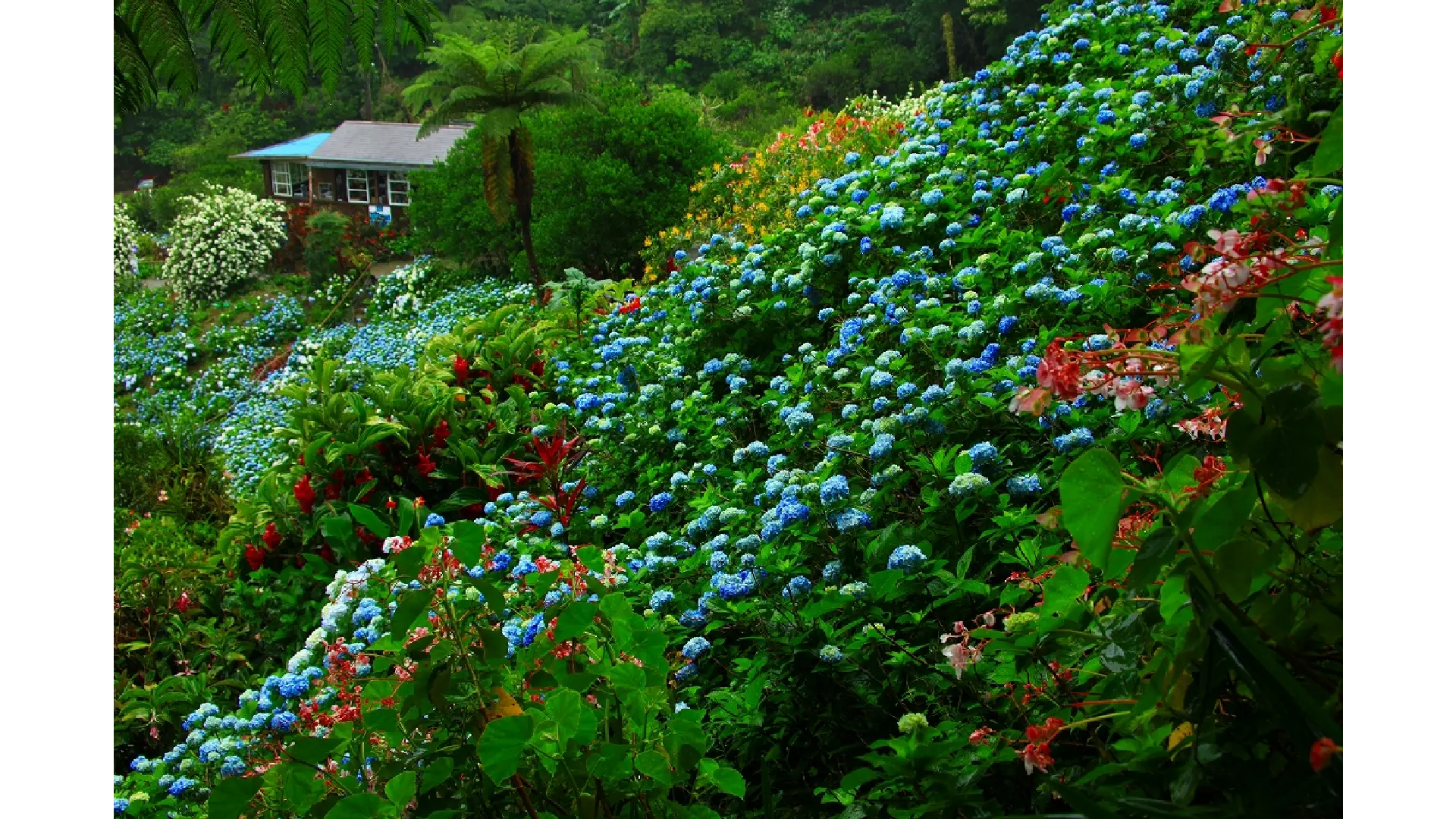 山の斜面がブルーのじゅうたんのようだ!来園者が思わず発した感嘆のことばです。自然のロケーションを生かし1万株、30万輪余のブルーのあじさいが咲き誇る景色は、見ごたえがあります(写真)。あじさいは、6年前に満100歳で他界した「あじさいおばー」こと、よへなウトが趣味で植えた2株が始まりです。コツコツとみかん畑の隙間を利用し増やし続けた結果、口コミで鑑賞者が増え、やむなくあじさい園を開園するに至りました。今では本土はもとより外国からも来園者を迎える沖縄県の観光資源の一つです。「あじさいおばー」こと、よへなウトさんについてはこちら https://yohena-ajisai.sakura.ne.jp/top/first/orner.htm