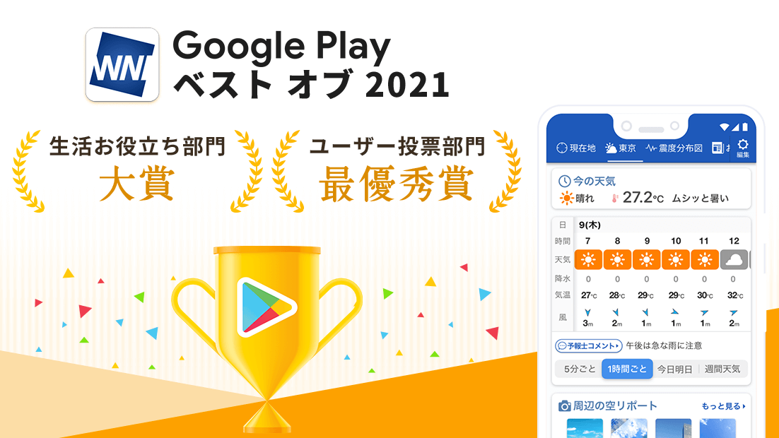 このたび、ウェザーニュースアプリが「Google Play ベストオブ 2021」の「生活お役立ち部門」で大賞、「ユーザー投票部門 アプリカテゴリ」で最優秀賞を受賞し、ダブル受賞となりました。