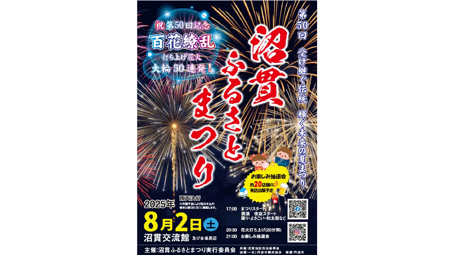会場周辺の丹波市立南小学校横(市道特15号線)及び佐野自治会の道路は一歩通行規制(3日17時~22時)。市道特15号線佐野橋は花火打上げ時間(20:30~)は立入禁止になります。 詳しくは交通警備員の指示に従ってください。 なお、沼貫地区内各集落を巡回するバスがありますので、そちらもご利用ください。