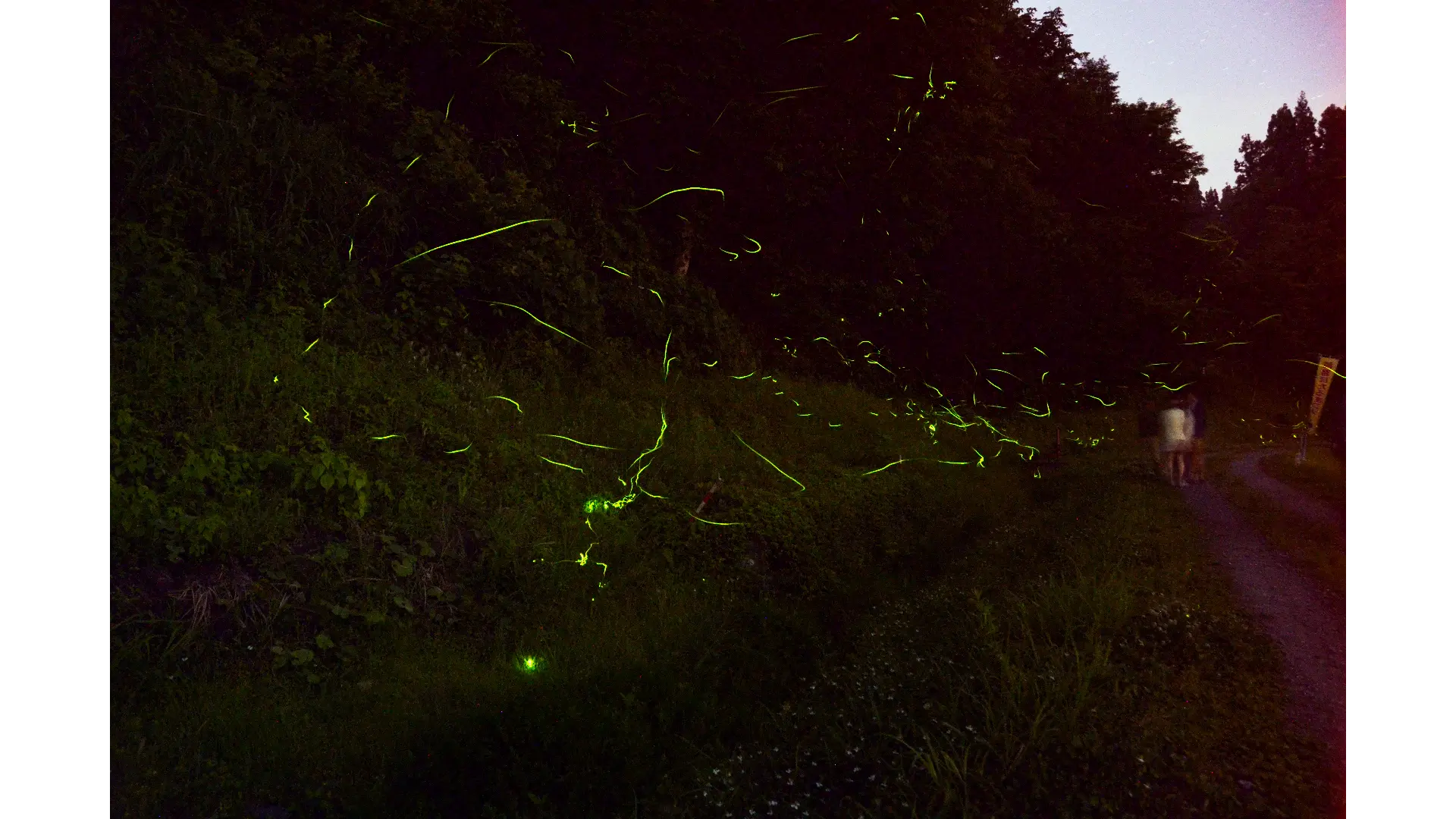 小川のほとりに広がる美しいホタルの光が、幻想的な世界を演出します。