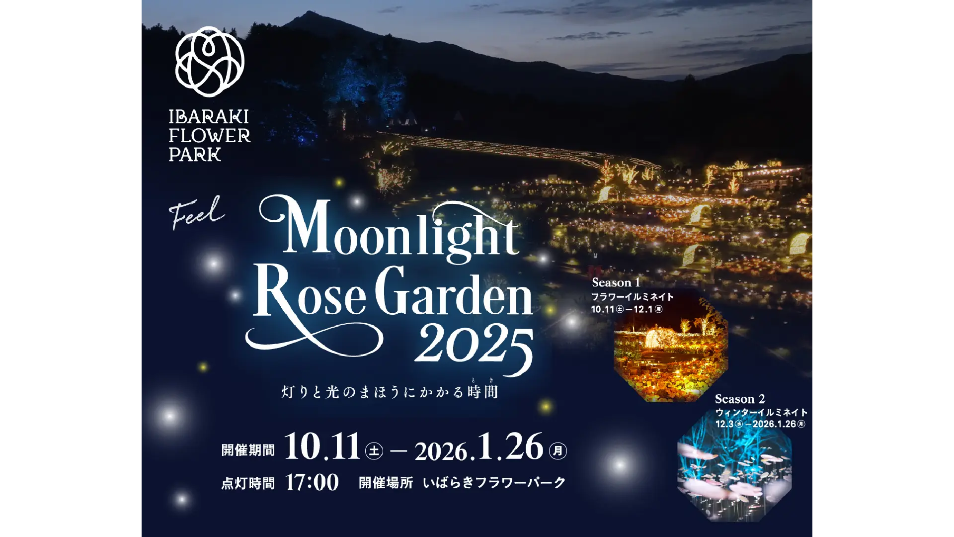 夜空に星がきらめく里山に、ライトアップされた花や自然が浮かび上がる「フラワーイルミネイト」。6000平方メートルのバラテラスに咲き誇るマリーゴールドと800品種の秋バラがやさしいシャンパンゴールドの灯りに照らされてライトアップ。月明かりに浮かびあがる夜の幻想的なバラ園をお楽しみください。
