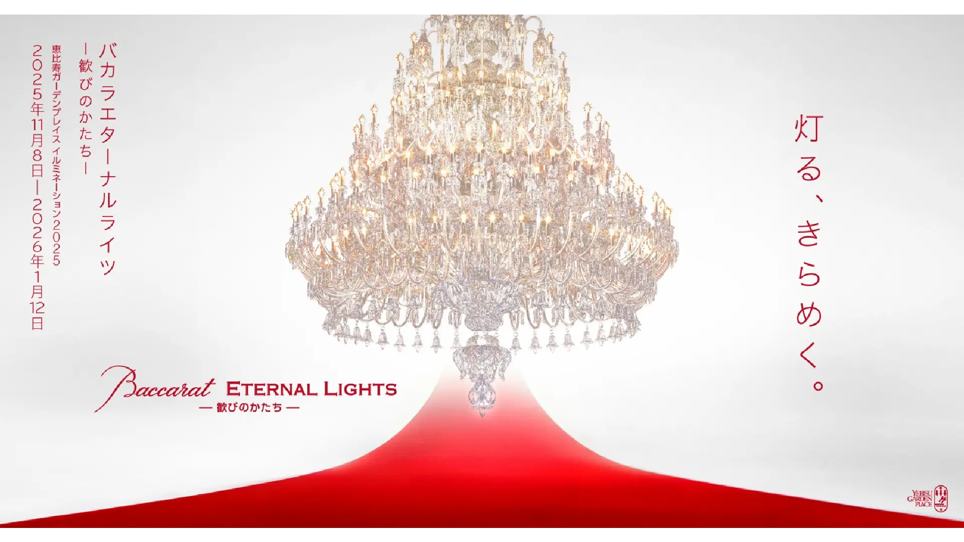 バカラ社と恵比寿ガーデンプレイスが1999年から開催している「Baccarat ETERNAL LIGHTS-歓びのかたち-」は、恵比寿の冬の風物詩として親しまれ、今年で26回目を迎えます。2025年のテーマは「灯る、きらめく。」。高さ約5m、幅約3m、クリスタルパーツ総数8500ピース、ライト総数250灯の世界最大級のシャンデリアが灯す輝きが、恵比寿のまちを華やかに包み込みます。初日である11月8日(土)17時からは、点灯式も予定しています。時計広場には全長約10メートルのクリスマスツリーが登場し、シャンデリアへ続く坂道のプロムナードを中心に灯る、シャンパンゴールドを基調とした約10万球の光のイルミネーションとともにきらめきます。さらに、昨年多くの皆様に足を運んでいただいたクリスマスマルシェを今年も開催。雑貨やギフトアイテムなど、クリスマスを彩るお店に加え、寒い季節にぴったりの特別メニューを提供するフードトラックも登場予定です。 恵比寿ガーデンプレイスは、一人でも多くの方に希望と笑顔が生まれることを願い、今年も世界最大級のシャンデリアの輝きを灯します。この冬、恵比寿ガーデンプレイスで特別なひとときをお過ごしください。