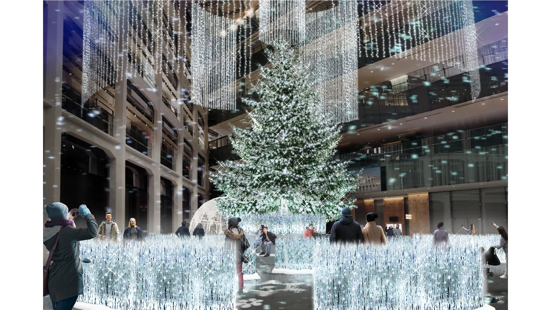 会場全体で約6万5千球ものLEDを使用し、白銀の大草原を創造。本物のモミの木を使用した高さ約13mの「シンボルクリスマスツリー」が光り輝く。期間中には、アトリウム空間の美しさをより引き立たせるライティングショーが毎日12:00~22:00の間、一定の間隔で実施される。