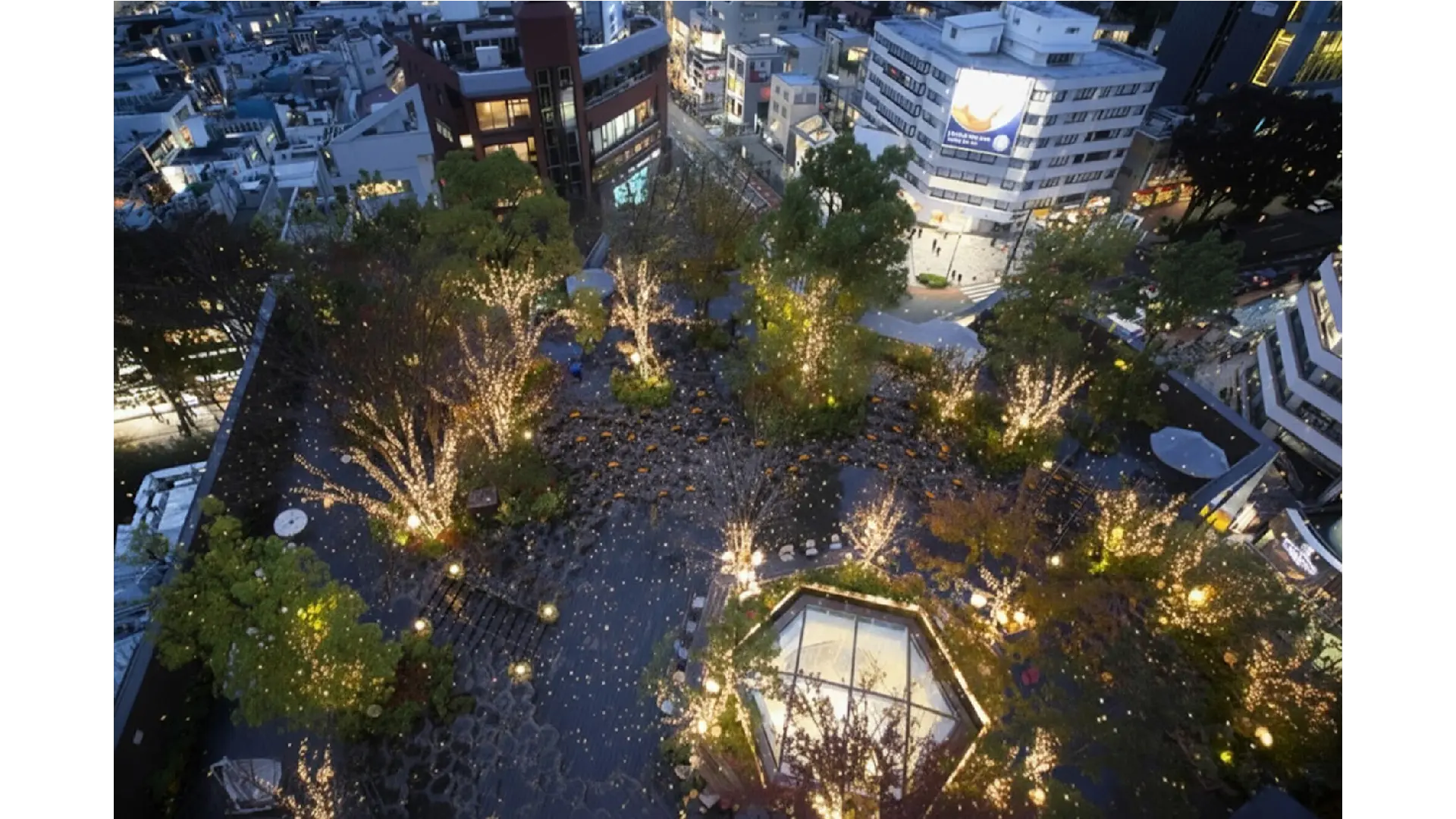 樹木に囲まれた屋上テラス「おもはらの森」を彩る「OMOHARA Christmas illumination」のコンセプトは、まるで星に手が届きそうな「星の降る森」をイメージ。表参道原宿エリアの中心でたくさんの流れ星が降り注ぐ様子を表現し、センターコートを中心に、街路樹までイルミネーションが広がるほか、期間中はシロクマやトナカイなどの動物モチーフのオーナメントやリーフを装飾した森の中で暖かさを感じられます。都心にありながら緑豊かなオープンテラスで、幻想的なイルミネーションをお楽しみいただけます。