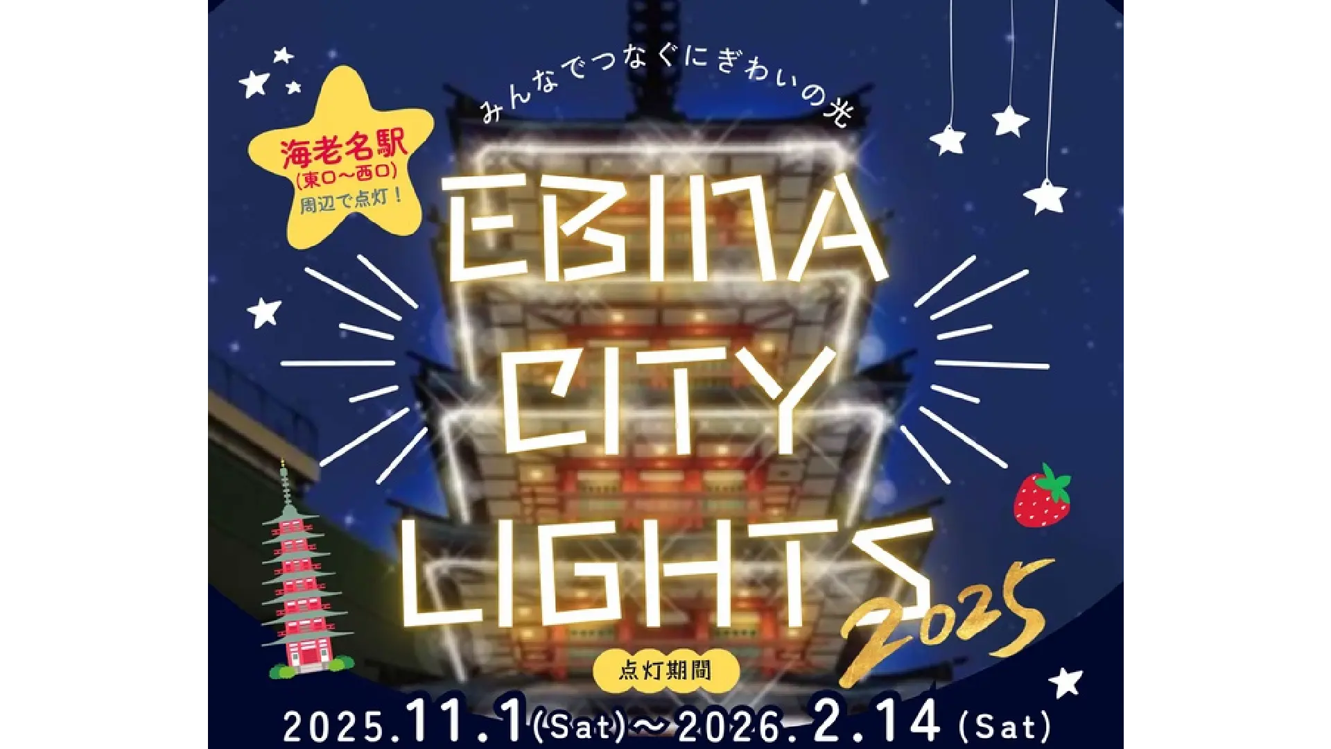 海老名駅東西をつなぐイルミネーション!海老名市市制施行日の11月1日から2月14日まで、海老名駅周辺で開催される、海老名の冬の風物詩「EBINA CITY LIGHTS 2025」。色とりどりの光が駅周辺を包み、幻想的な雰囲気を演出します。海老名中央公園をメインに、七重の塔やもみの木など、約12万球のLEDが点灯します。ぜひお立ち寄りください!