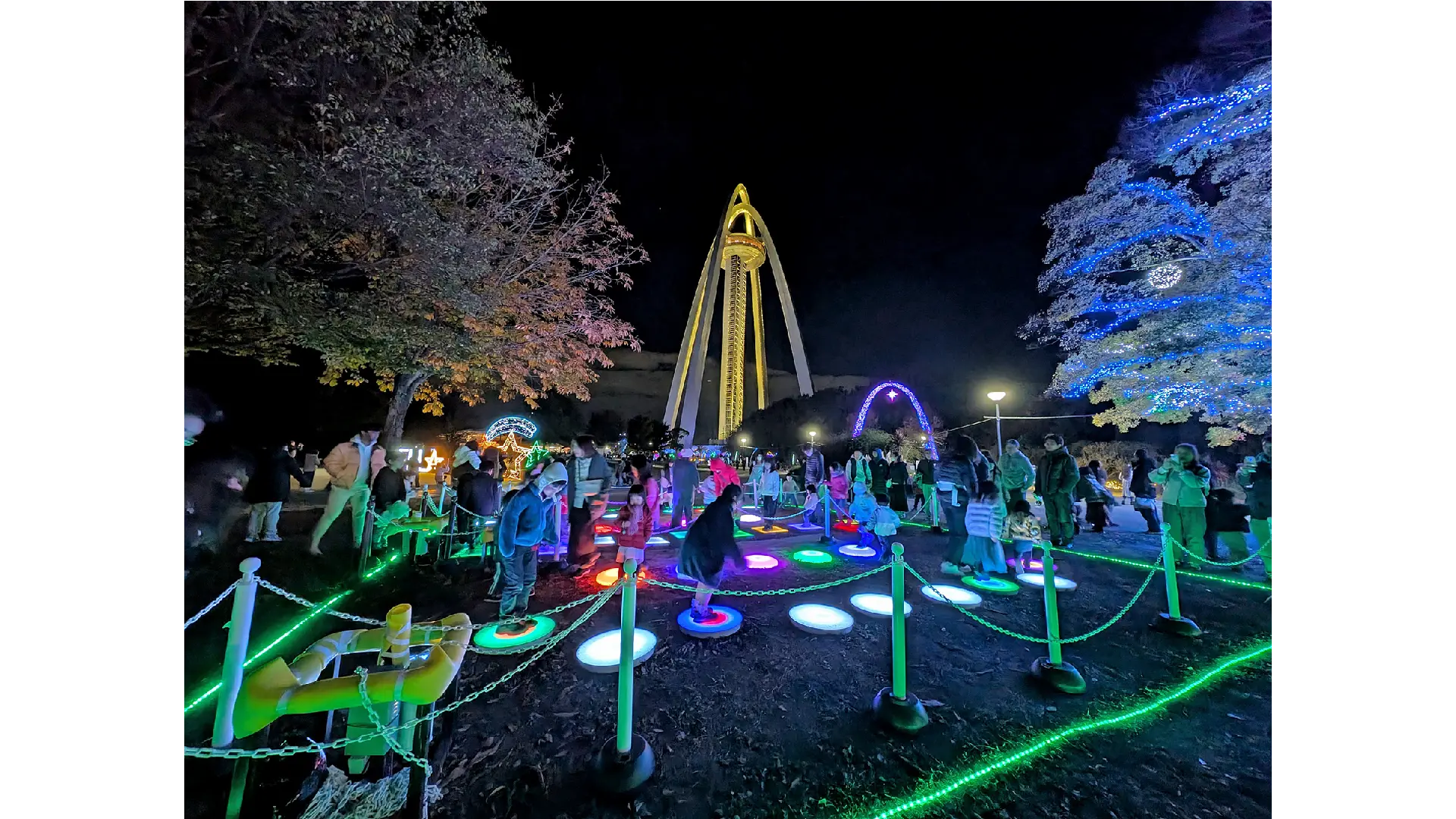 2025年のテーマは「MIRAI~今までも、これからも」。園内各所に「夢や希望」「祈り」「平和や繁栄」「新芽」などをイメージしたイルミネーションが輝く。また、光と遊べるインタラクティブ・イルミネーションも各所に登場する。またキッチンカーの出店もあり、ホットグルメも楽しめる。