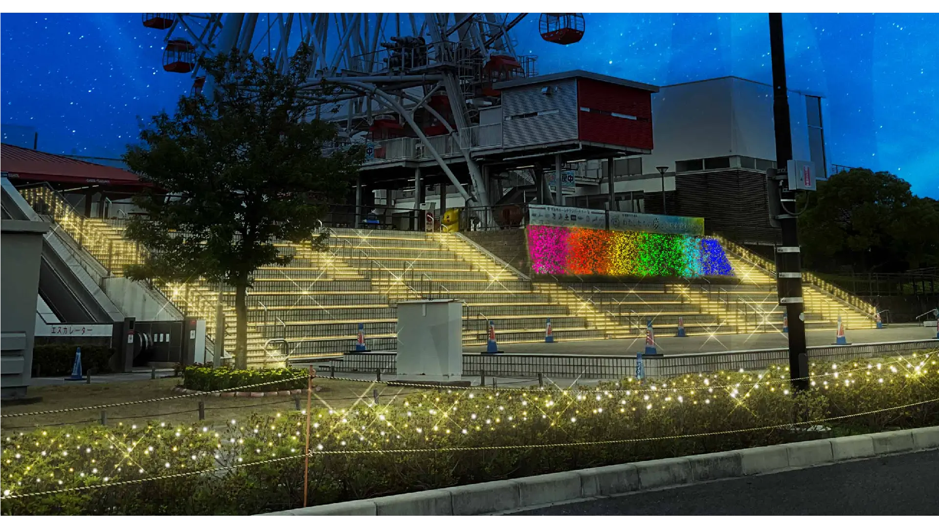 2025年度の冬季イルミネーションは、20周年を経て新たな気持ちで踏み出した一歩が、輝く歩みになるように願いを込めて。今年は観覧車下オアシスステージ前の階段がイルミネーション会場のひとつとなっています。迫力あるイルミネーションをぜひご覧ください。