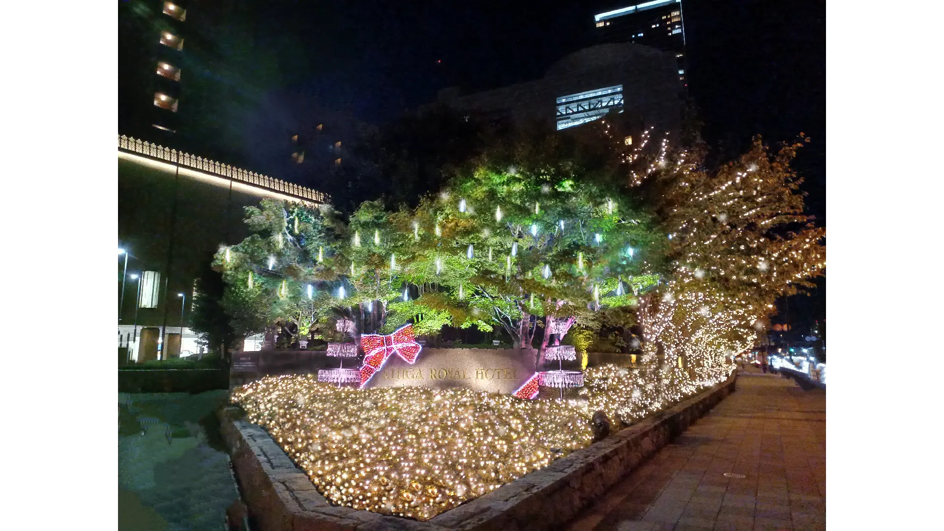 ホテル前並木を約5万球のLEDライトで華やかにライトアップします。ホテル名石板にはプレゼントBOXのような楽しさを演出する赤いリボン型のLEDを飾り、流れ星が降るようなイルミネーションや風に揺れるクリスタルオーナメントを施します。※並木のイルミネーションは2025年2月2日(日)まで。