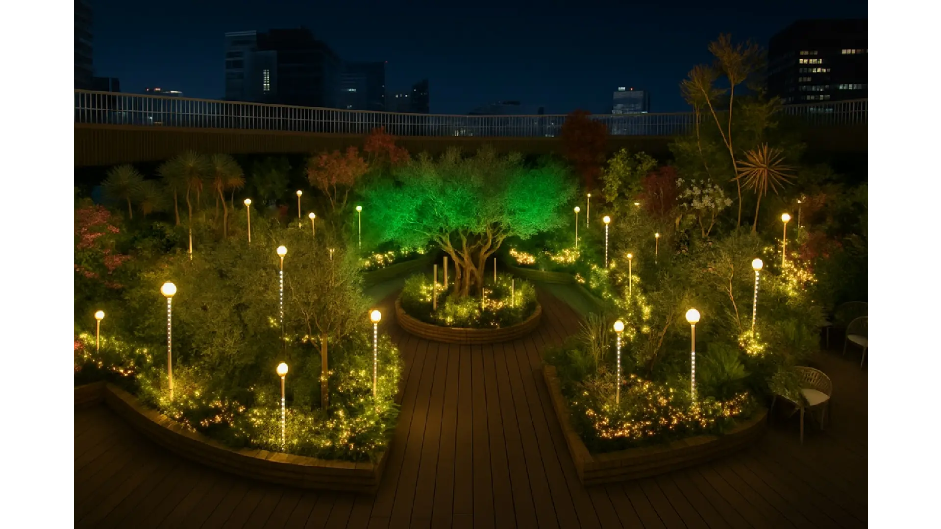 プラントハンター西畠清順氏が手がけた11F屋上庭園そらガーデンは、今年オープンより10周年を迎え、5年ぶりにイルミネーションを刷新。シンボルツリーである樹齢500年のオリーブの巨木を取り囲むように集められた世界中の植物から、湧き上がるエネルギーをイメージした光がまるで呼吸するように瞬き、冬の夜空へと立ちのぼります。街のざわめきから離れた屋上で、クリスマスだけの幻想的なガーデンをお楽しみください。