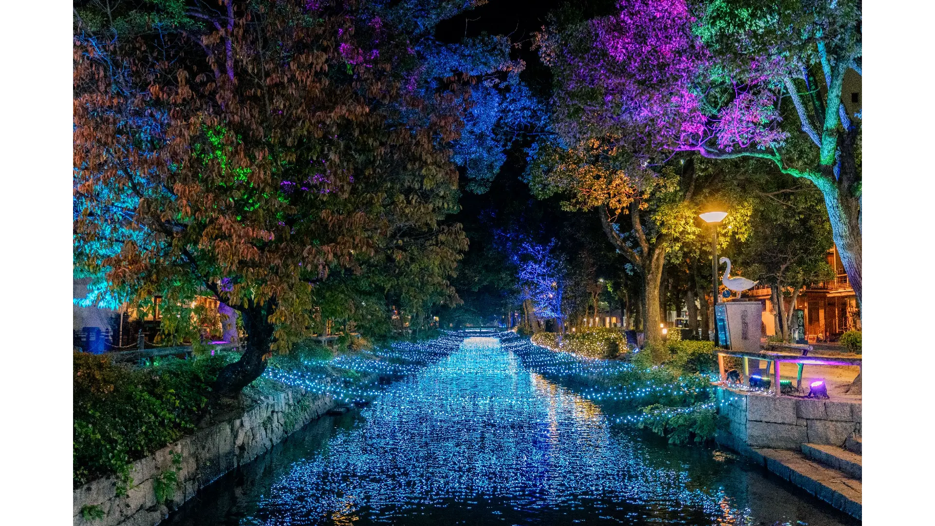 冬の「西川緑道公園」を華やかな光の装飾で彩ります。水辺に輝く色とりどりのイルミネーションや高さ4mのクリスマスツリーがお目見え。光きらめく星月夜の世界を演出します。