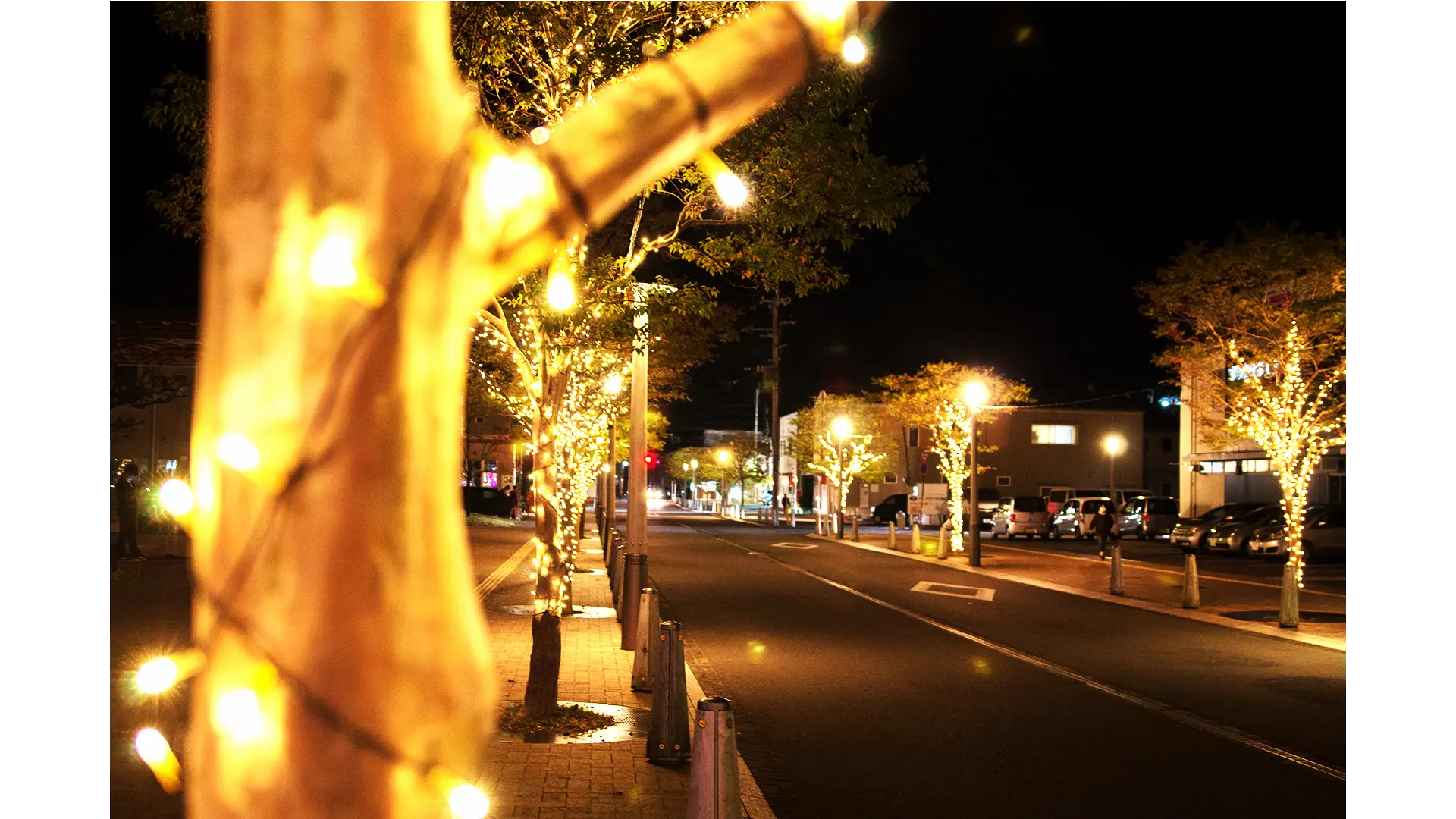「歩きたくなる街」をテーマに、JR日向市駅前を約3万球のシャンパンゴールドの光が彩り、日向市駅で流れるジャズと共にお楽しみいただけます。また、地元・日向工業高校生が制作する「光のモニュメント」の展示も行われ、大人から子どもまで楽しめるイルミネーションとなっています。