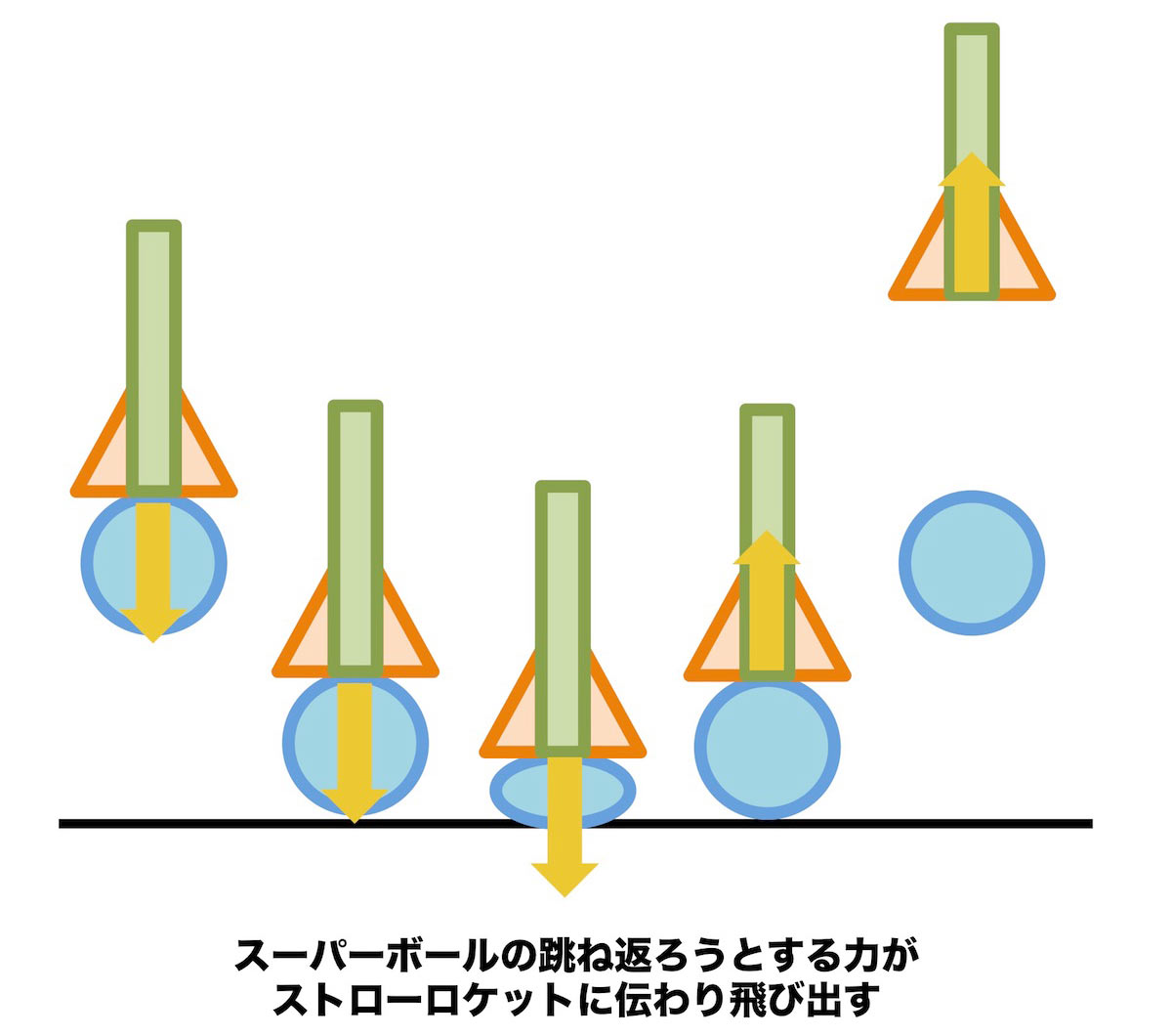 スーパーボールは「ゴム」でできています。ゴムには、元に戻ろうとする性質=弾性があります。この力はスーパーボールにもあります。もとに戻ろうとする力がロケットに移り、高く飛ばすことができるのです。