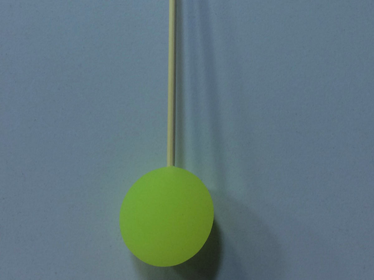 1. スーパーボールに竹串を差して固定します。竹串の先端が指などに刺さらないよう、充分に注意してください。