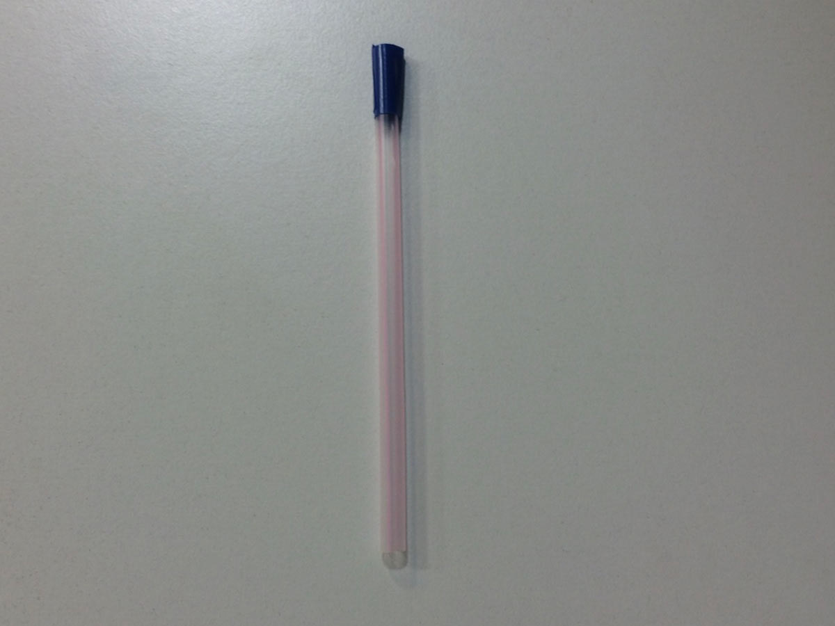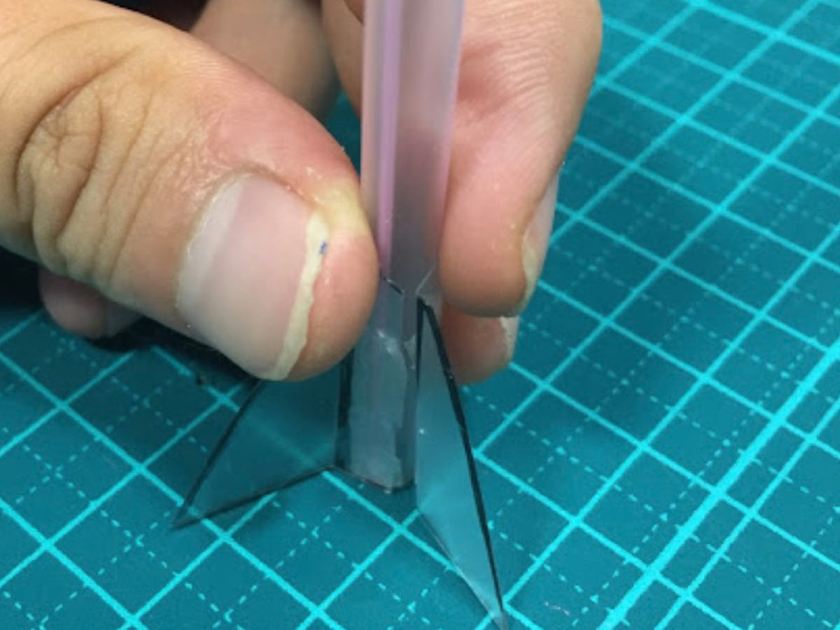 3. ストローにロケットの羽となるパーツをつけます。クリアファイルを切ってパーツを作り、ビニールテープを巻いた方の反対側に接着剤でつけましょう。