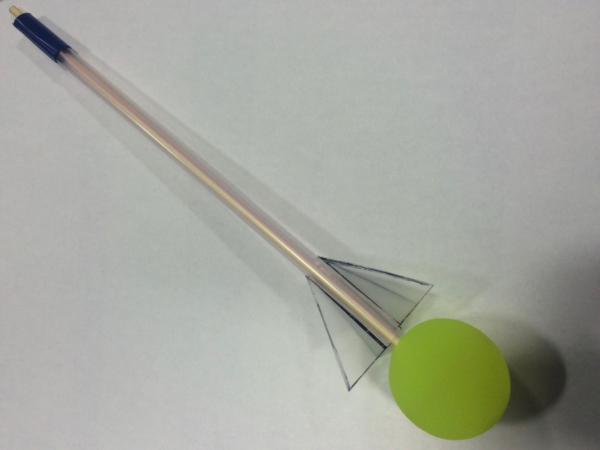 4. これで完成です! ロケットを竹串にさせば準備完了。ロケットが地面に対してまっすぐになるように持ち、ゆっくりと床に落としてみましょう。ロケットは、どのくらいの高さまで飛びましたか?