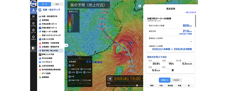 地上での風の予想に、気象庁台風やWNI独自台風予想を重ね合わせてみることができます。登録地点の最接近時刻等も表示します。