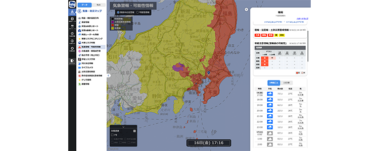 気象庁が発表している気象警報・注意報や、警報発表の可能性をマップ上で表示します。登録地点の発表状況も表示します。