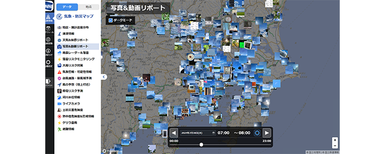 ウェザーリポーターからのリポート報告を表示します。「カテゴリ」や「動画・写真」、「キーワード」で絞り込むことができます。