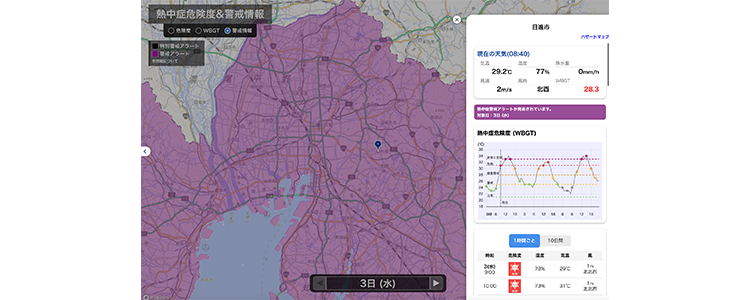 熱中症危険度情報、WBGT、熱中症警戒アラートの発表状況を表示します。