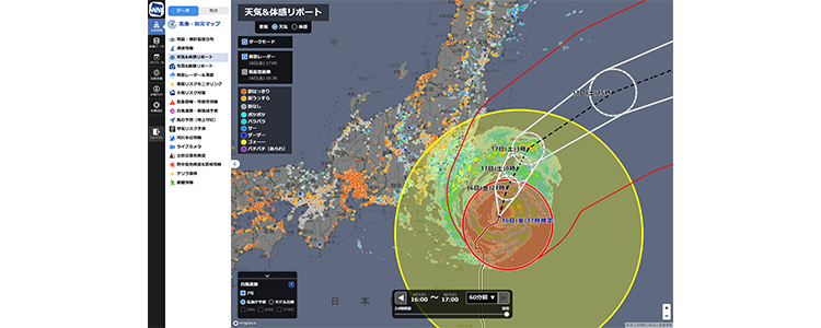 ユーザーからのリポート投稿や雨雲レーダー、WNI独自台風予測を、それぞれ、地図上に表示します。登録地点での状況を表示します。