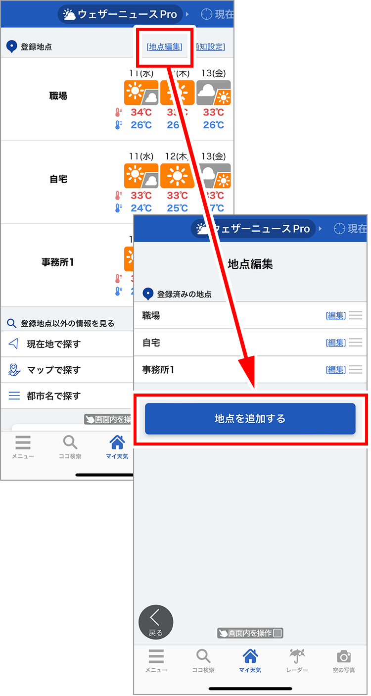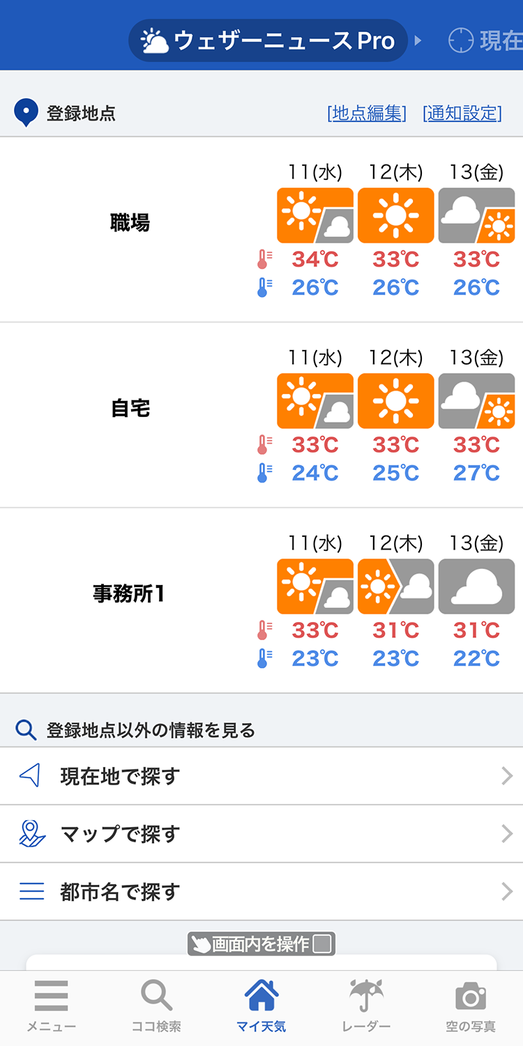 「ウェザーニュースPro」ページから、地点登録をすることができます。